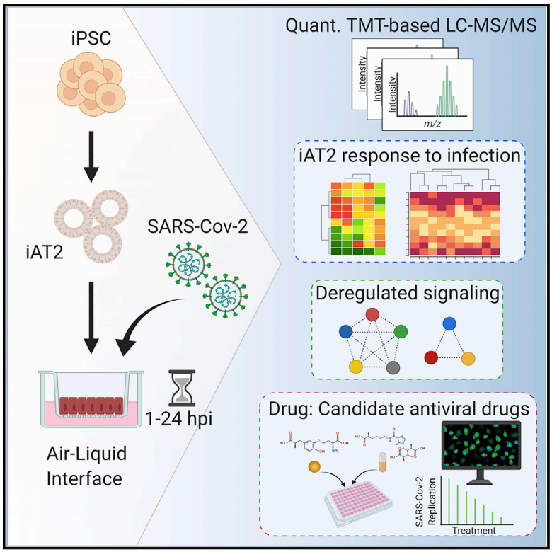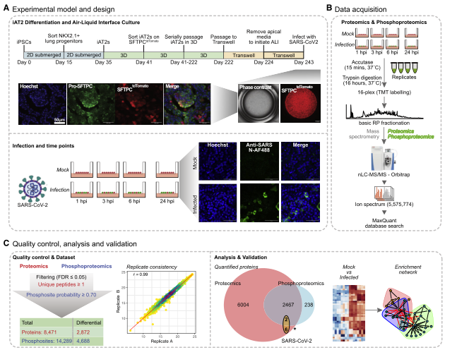 研究人员通过将生物工程化的人体肺泡细胞与复杂的高精度质谱技术相结合,已经鉴定出肺细胞中的宿主蛋白和通路,在被新冠病毒感染后这些蛋白和通路水平会发生变化,从而洞悉疾病病理学和新的治疗靶标来阻断新冠病毒感染。
