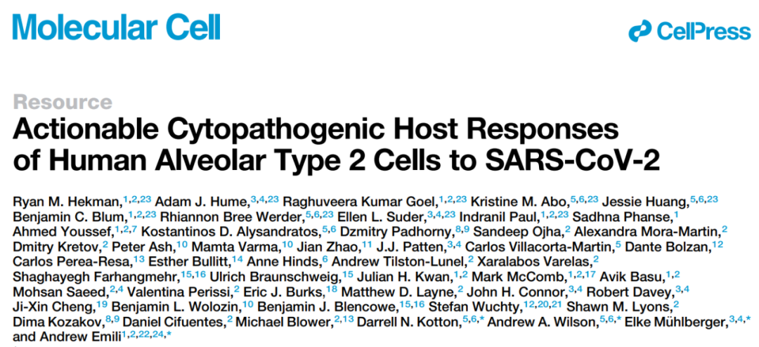 近日,Cell 子刊 Molecular Cell 杂志发表了一项题为:Actionable Cytopathogenic Host Responses of Human Alveolar Type 2 Cells to SARS-CoV-2的研究论文。报道了首个人类肺部感染新冠病毒后的分子反应图谱。