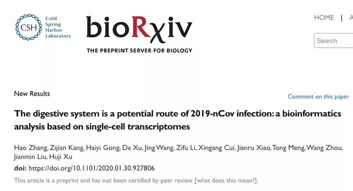 2020年1月31日,上海第二军医大学等单位合作在生物预印本 bioRxiv 在线发表题为:The digestive system is a potential route of 2019-nCov infection: a bioinformatics analysis based on single-cell transcriptomes 的研究论文。