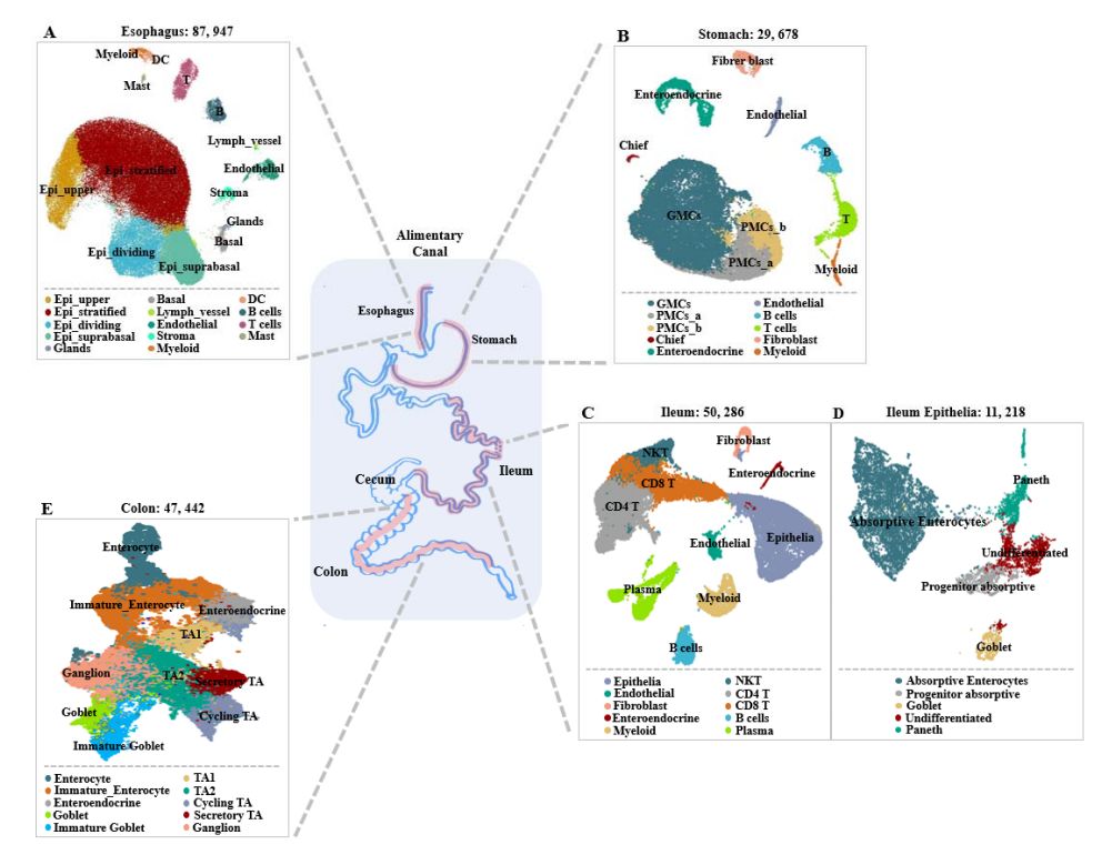 该论文的研究人员通过单细胞转录组测序,析了肺、食道、胃、回肠和结肠的单细胞转录组的数据集剖析表达细胞受体血管紧张素转化酶II(ACE2)的细胞组成和比例,并以此来探究新型冠状病毒(2019-nCov)在消化系统感染中的潜在途径。