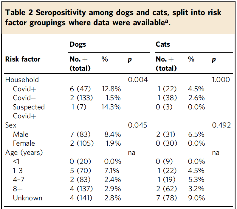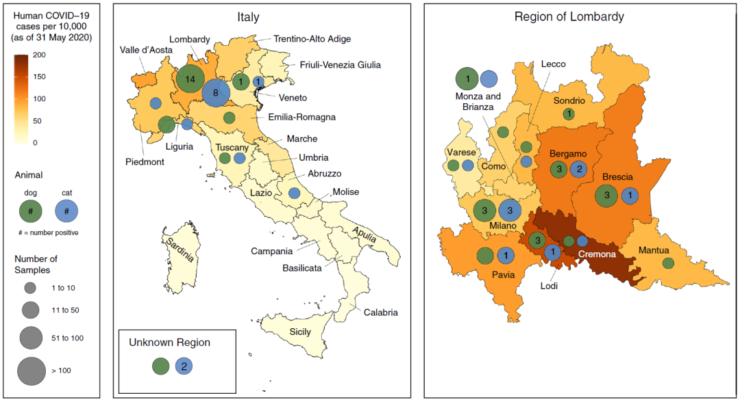 研究人员在意大利北部地区(主要为伦巴第地区)采集了919只宠物的样本,发现其中3.3%的狗和5.8%的猫具有可检测的新冠病毒中和抗体滴度。更值得注意的是,新冠确诊患者的宠物猫和宠物狗被检测出抗体阳性的概率更高。