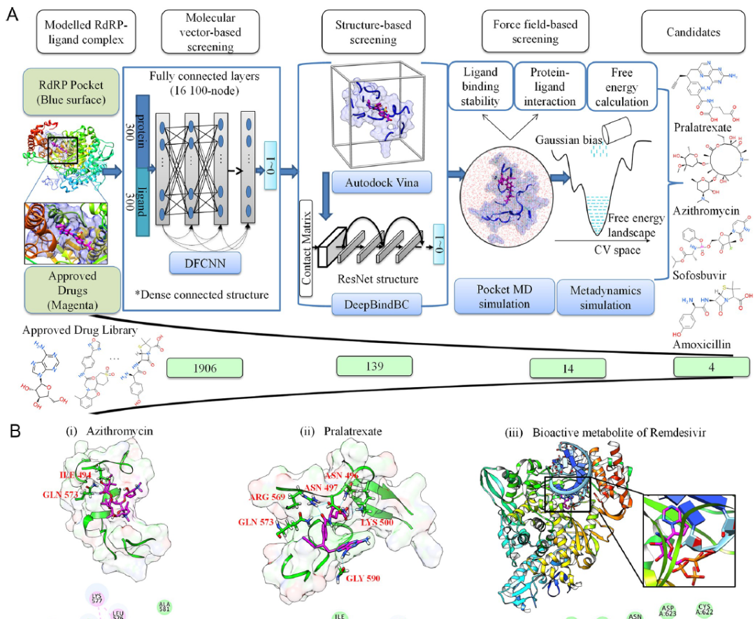 该团队使用不同AI平台筛选了1906种当前市售药物库,以了解它们与新冠病毒的RNA依赖性RNA聚合酶(RdRP)的结合能力。对于像新冠病毒(SARS-CoV-2)这样的RNA病毒,RdRp对于病毒的复制和感染细胞并存活至关重要。