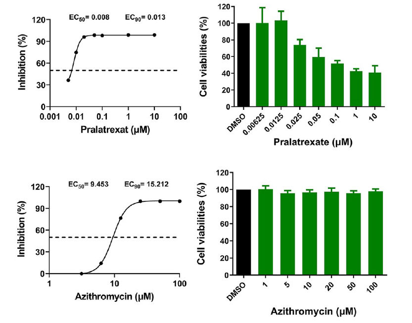 其中的Folotyn(普拉曲沙) 和阿奇霉素,能够抑制新冠病毒(SARS-CoV-2)在细胞中的复制。