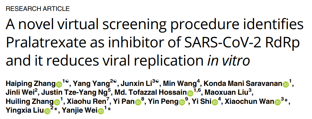 近日,中国科学院深圳先进技术研究院魏彦杰等人在 PLOS Computational Biology 杂志发表了题为:A novel virtual screening procedure identifies Pralatrexate as inhibitor of SARS-CoV-2 RdRp and it reduces viral replication in vitro 的研究论文。