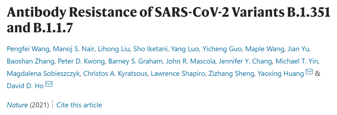 2021年3月8日,Nature 以加速上线形式发表了何大一团队题为:Antibody Resistance of SARS-CoV-2 Variants B.1.351 and B.1.1.7 的新冠变体研究论文。