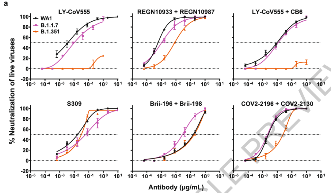 但是,南非突变株(B.1.351)的结果更加令人担忧,该突变株既能够逃逸大多数靶向新冠病毒刺突蛋白(S蛋白)的单克隆抗体,还能够逃逸多个靶向受体结合域(RBD)的单克隆抗体。