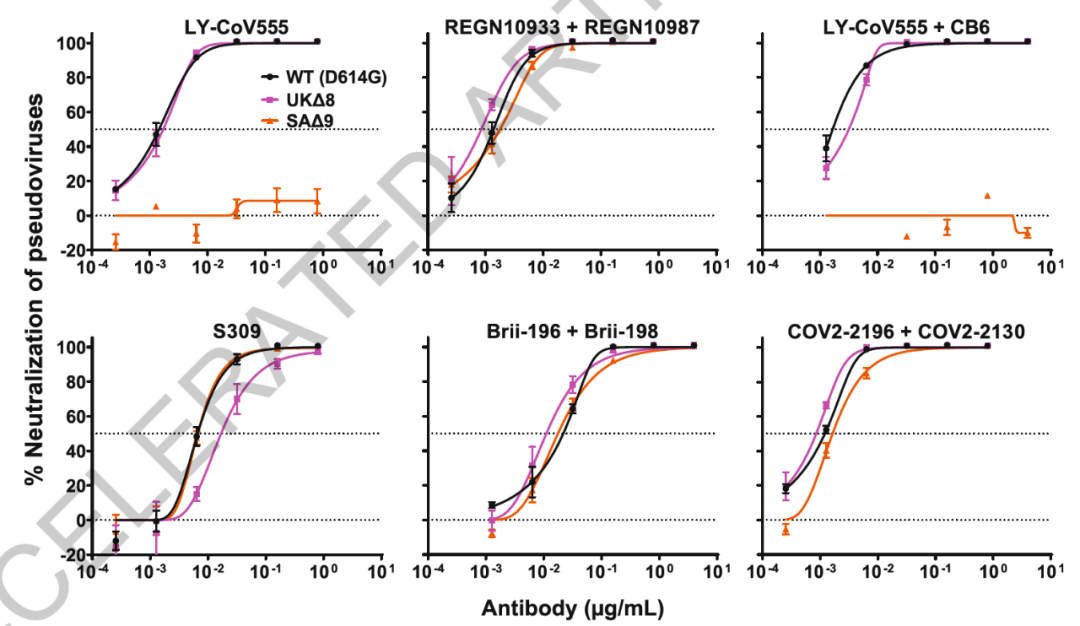最后,研究团队发现,不同单克隆抗体组成的“抗体鸡尾酒”疗法对这些新冠突变株仍然能够有效发挥中和作用。