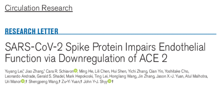 2021年4月30日,西安交通大学第一附属医院袁祖贻、美国加州大学圣地亚哥分校 John Y-J. Shyy 等人领导的研究团队在 Circulation Research 期刊发表了题为:SARS-CoV-2 Spike Protein Impairs Endothelial Function via Downregulation of ACE 2 的研究论文。