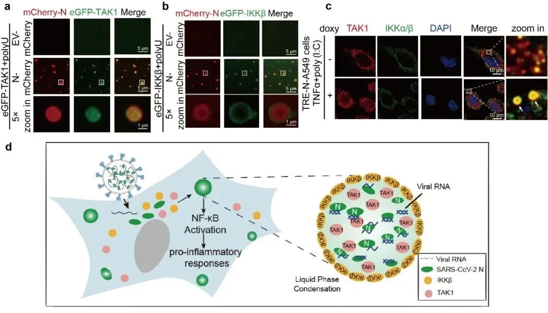 新冠病毒核衣壳(N)蛋白通过形成LLPS招募TAK1及IKKβ促进宿主NF-κB通路过度激活:a-b,纯化新冠病毒N蛋白、TAK1及IKKβ,体外重构相分离体系;c,细胞内新冠病毒N蛋白促进TAK1与IKKβ形成的“LLPS液滴”;d,新冠病毒N蛋白通过LLPS促进NF-κB通路机制示意图。