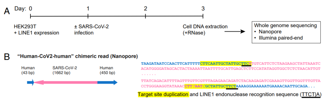 在之前的预印本论文中,研究团队在体外细胞实验中证实,当新冠病毒感染过表达逆转录酶LINE-1的人类细胞时,新冠病毒基因组会整合到人类基因组中。