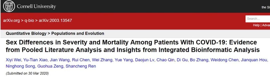 2020年3月31日,上海长海医院任善成教授团队在 Arxiv 预印本发表了一项荟萃分析论文,通过对来自中国、日本、韩国、新加坡、意大利、英国等六个国家共77932例新冠患者的分析,发现男性在新冠肺炎的发病率、重症率和死亡率方面均显著高于女性。