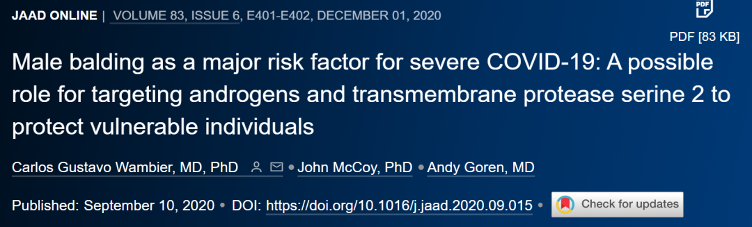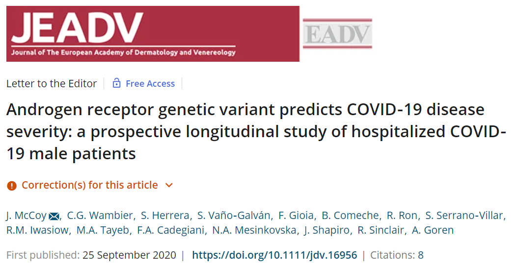 该研究成果医学会议上提出的,尚未在经过同行评审的期刊发表,但在此之前,Andy Goren 博士已发表多篇论文提出男性秃顶是新冠重症的主要危险因素,雄激素受体(AR)基因突变可预测新冠严重程度等。