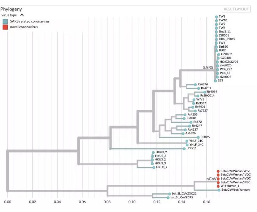 与此前在云南中菊头蝠上检测到的蝙蝠冠状病毒RaTG13相比较,nCoV-2019在整个基因组中与其有96.2%的一致性,与SARS冠状病毒有79.5%的一致性。