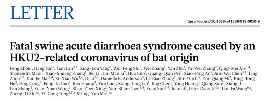 2018年4月4日,国际顶尖学术期刊 Nature 杂志发表了一篇有关新型冠状病毒在中国广东省引起小范围猪急性腹泻的研究论文——《Fatal swine acute diarrhoea syndrome caused by an HKU2-related coronavirus of bat origin》。