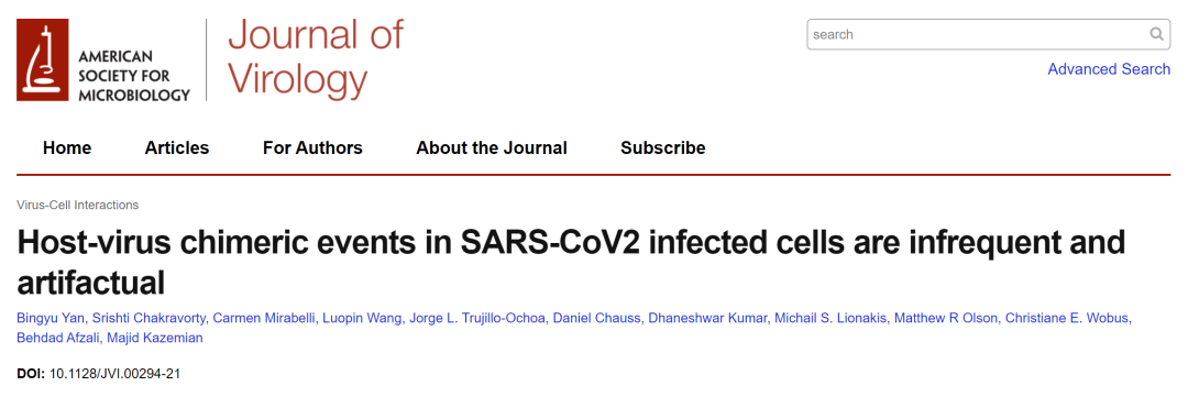 而就是在上述PNAS论文上线几天后,著名病毒学期刊 Journal of Virology 发表了来自美国普渡大学的一篇题为:Host-virus chimeric events in SARS-CoV2 infected cells are infrequent and artifactual 的研究论文。