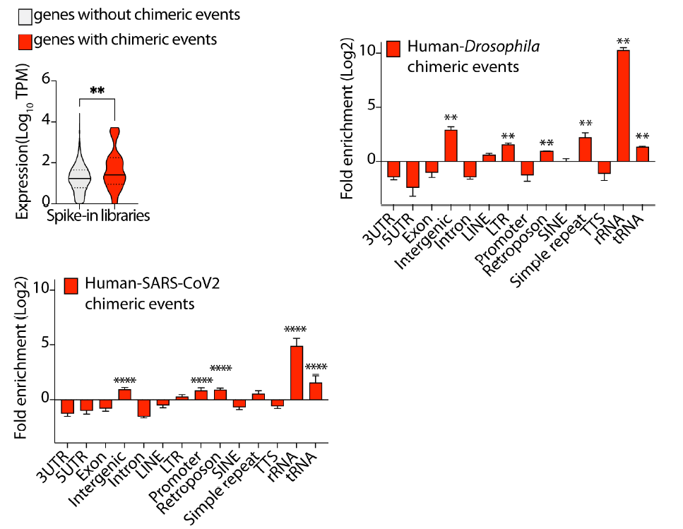 然而,检测结果表明,嵌合事件的发生频率实际上不大于先前数据表明的背景噪声。从受感染细胞的RNA中大量富集新冠病毒(SARS-CoV-2)序列时,并没有富集到病毒基因组嵌合。