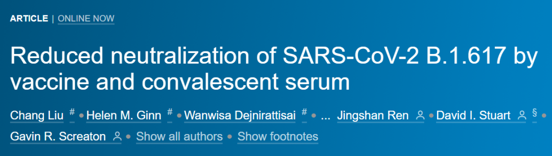 近日,国际顶尖学术期刊 Cell 发表了来自牛津大学的一篇题为:Reduced neutralization of SARS-CoV-2 B.1.617 by vaccine and convalescent serum 的研究论文。