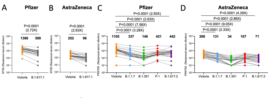 用注射过辉瑞、阿利斯康两针剂疫苗的个体的血清进行中和测试,发现其对Kappa、Delta变异株的中和作用相较于标准株的中和作用也有不同程度的降低。