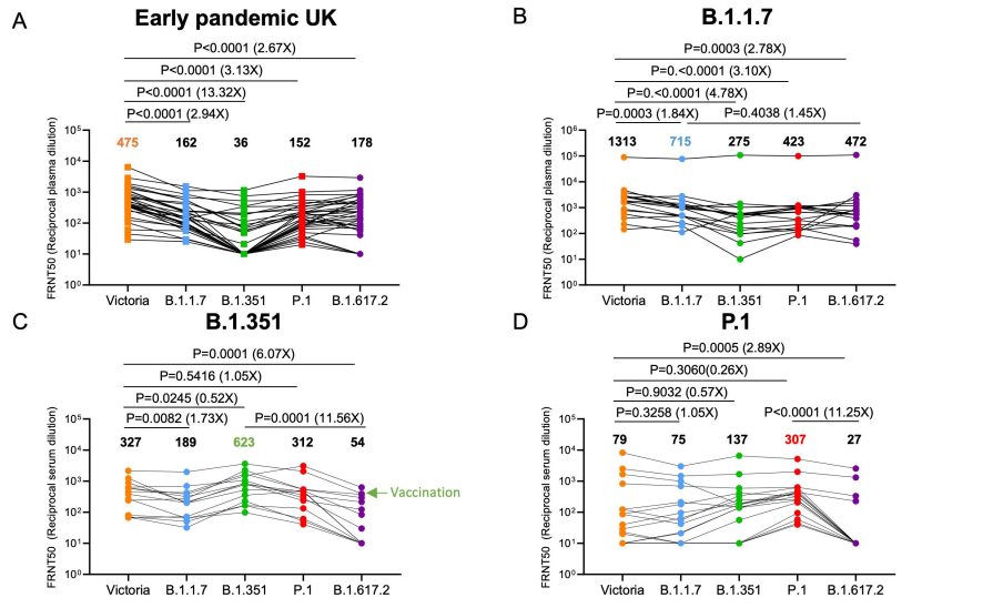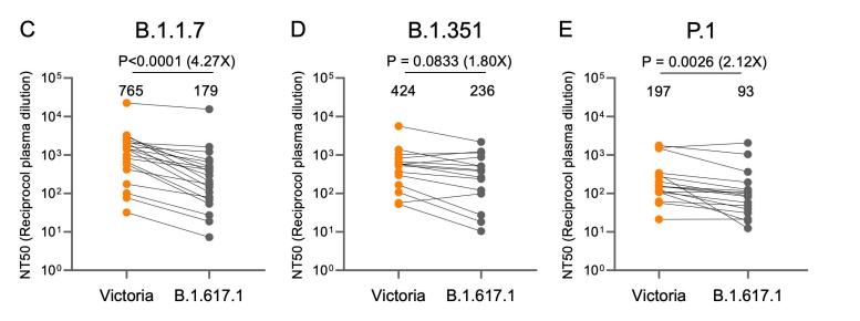 研究发现,感染过Alpha变异株(B.1.1.7)患者的血清,对标准株(Victoria)的中和活性FRNT50为765,对Kappa变异株(B.1.617.1)为179。