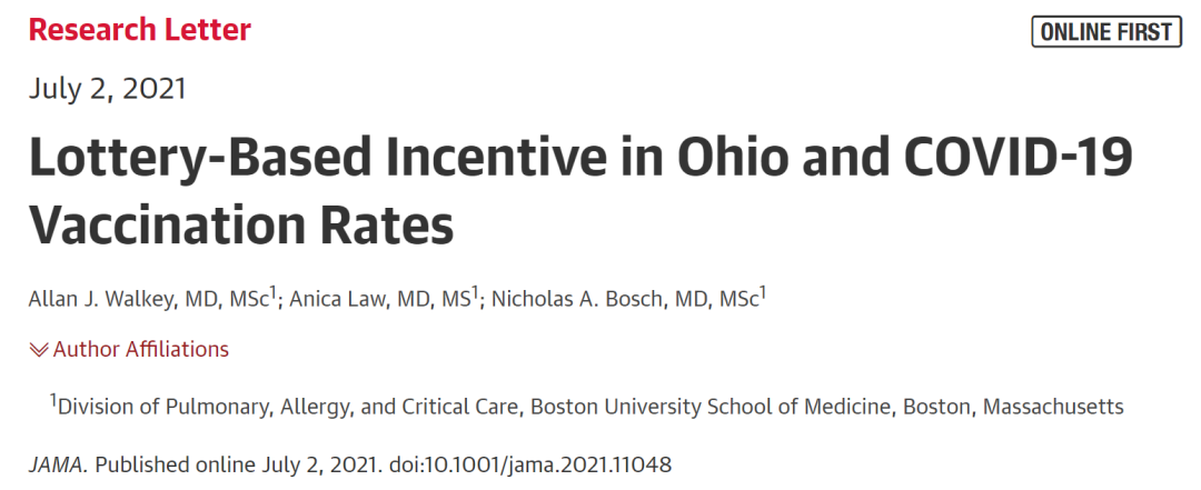 2021年7月2日,美国波士顿大学医学院的研究人员在 JAMA 发表了题为:Lottery-Based Incentive in Ohio and COVID-19 Vaccination Rates 的文章。