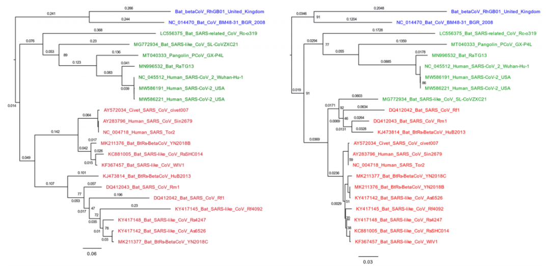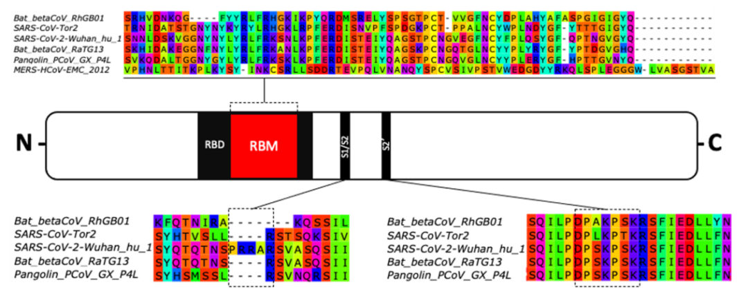 研究团队在英国马蹄蝠中发现了一种与新冠病毒相关的新的冠状病毒——RhGB01,该冠状病毒的刺突蛋白(S蛋白)的受体结合域(RBD)的氨基酸序列与SARS-CoV-2有77%同源性,与SARS-CoV有81%同源性。