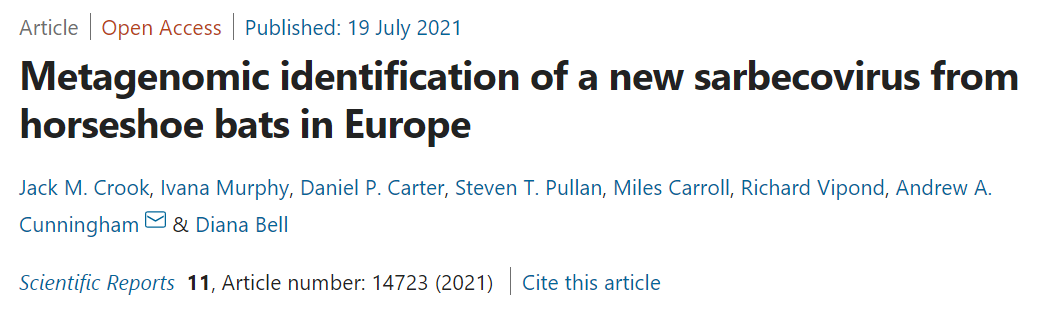 2021年7月19日,英国东英吉利大学、伦敦动物学会和英国公共卫生机构的研究人员合作,在 Scientific Reports 期刊发表了题为:Metagenomic identification of a new sarbecovirus from horseshoe bats in Europe 的研究论文。