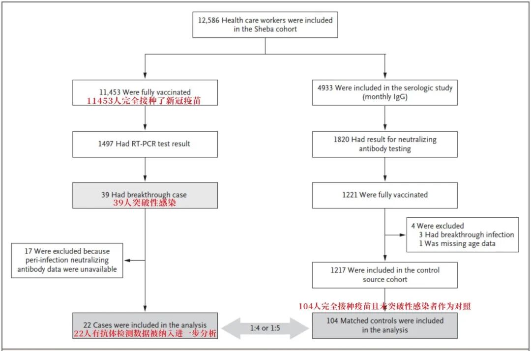 这39名完全接种疫苗后仍感染的突破性感染者中,有22人在确诊当天或一周前进行了抗体检测。研究团队还对与这39人年龄等因素相匹配的其他104接种疫苗后未感染者的抗体数据进行比较分析。