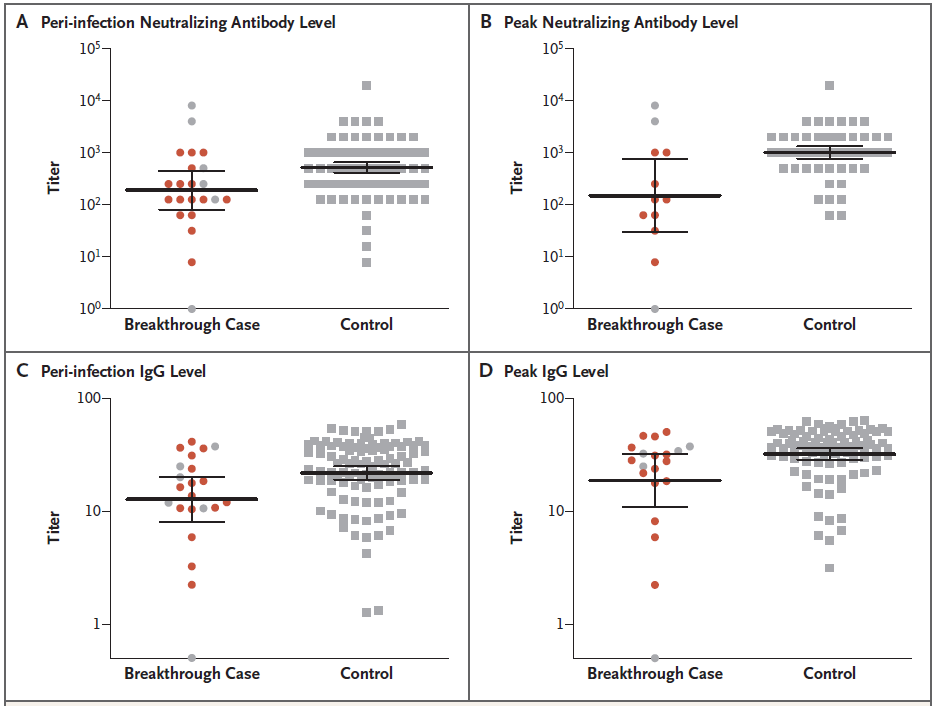 对于这些突破性感染者,该研究发现他们的中和抗体水平较低,表明接种疫苗后的峰值抗体滴度与疫苗的保护效力相关,这也是第一个证明突破性感染者中和抗体水平低的直接性证据。