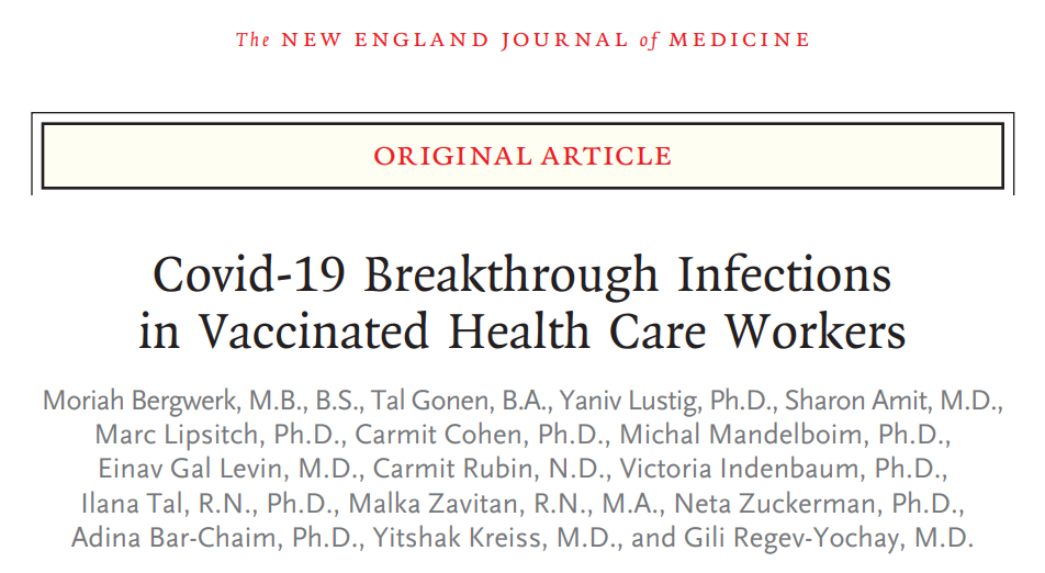2021年7月28日,国际顶尖医学期刊《新英格兰医学期刊》(NEJM)发布了题为:Covid-19 Breakthrough Infections in Vaccinated Health Care Workers 的研究论文。