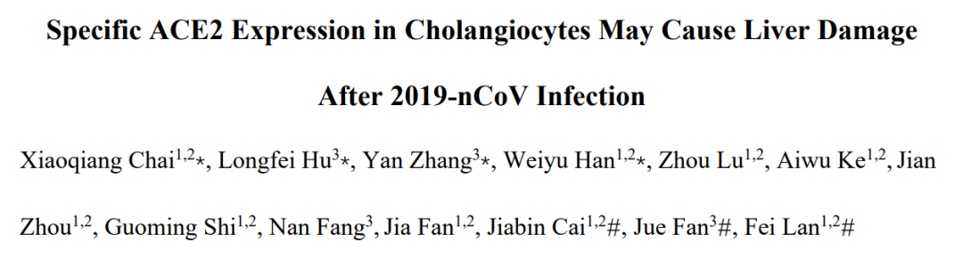 2020年2月4日,复旦大学附属中山医院肝癌研究所蓝斐研究员、蔡加彬等在预印本 bioRxiv 在线发表题为:Specific ACE2 Expression in Cholangiocytes May Cause Liver Damage After 2019-nCoV Infection 的研究论文。