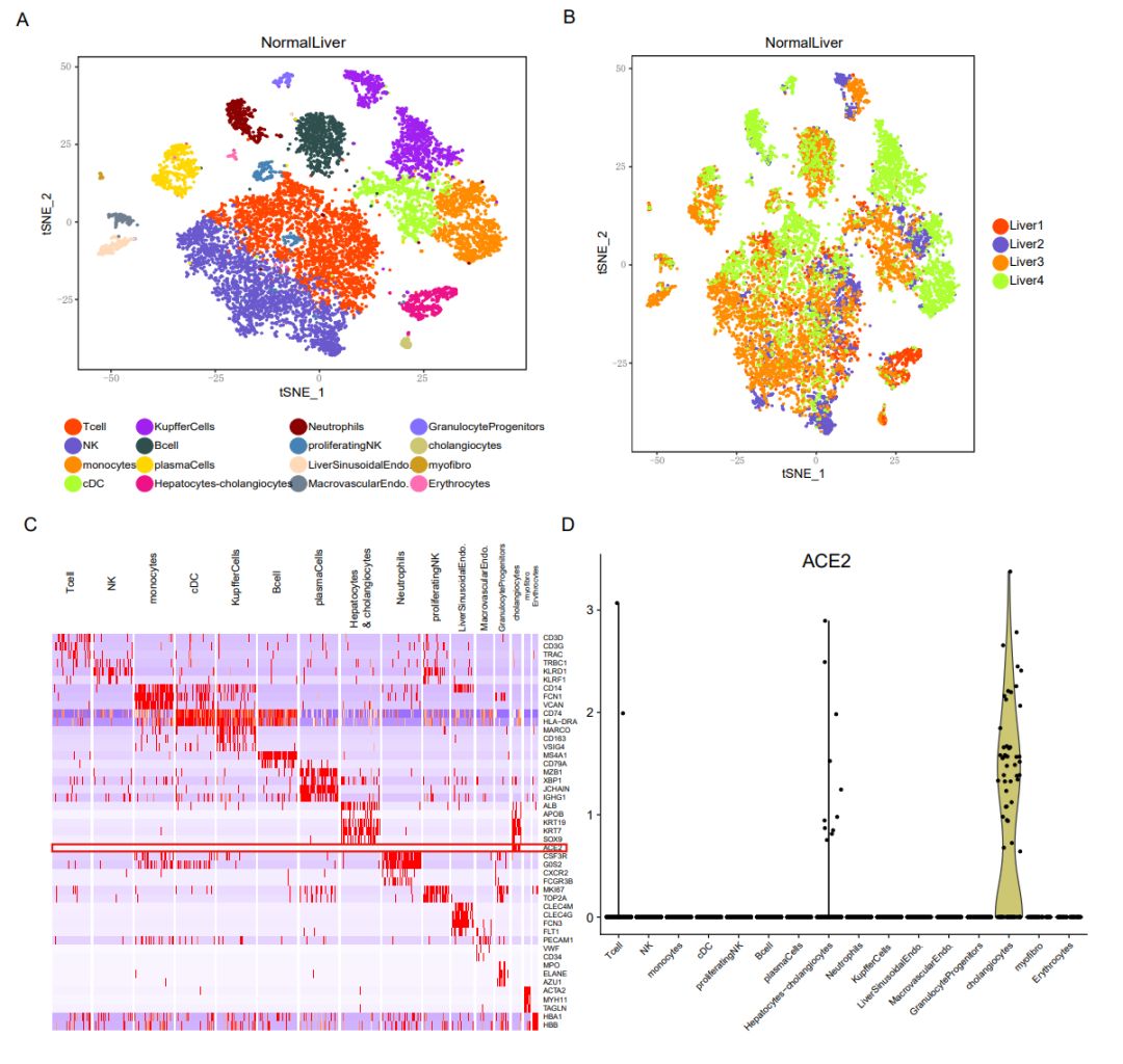 该研究使用两个独立队列的单细胞RNA-seq数据对健康肝脏组织特异性表达ACE2的细胞类型进行了评估,发现胆管细胞高特异性表达新冠病毒受体ACE2,而肝细胞则表达很低。