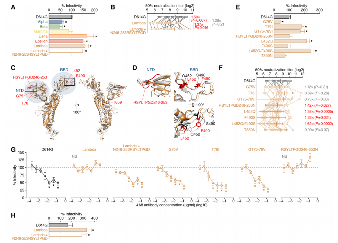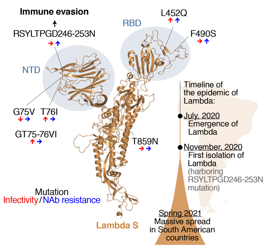 在这项研究中,研究人员发现,在Lambda突变株的S蛋白的N端结构域(NTD)中插入的RSYLTPGD246-253N突变与病毒毒力增加有关。该突变是Lambda突变株在南美洲国家迅速传播的原因。