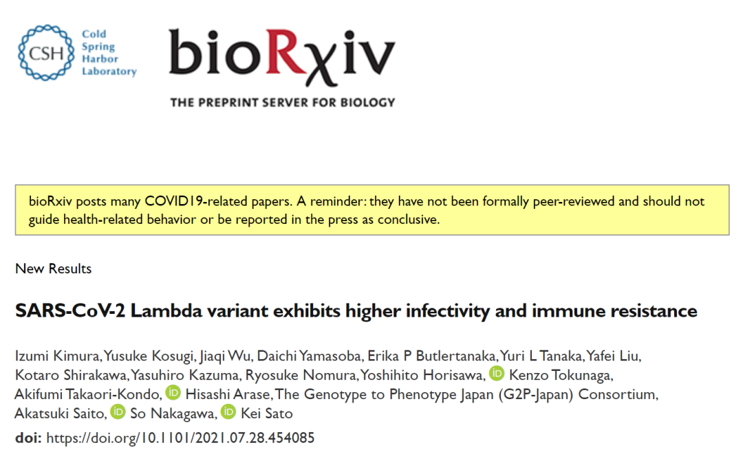 2021年7月28日,东京大学的研究人员在预印本 bioRxiv 发表了题为:SARS-CoV-2 Lambda variant exhibits higher infectivity and immune resistance 的论文,该研究利用分子系统发育分析揭示了Lambda突变株的进化特征,并指出Lambda突变株具有更强的传染性和免疫抵抗力。