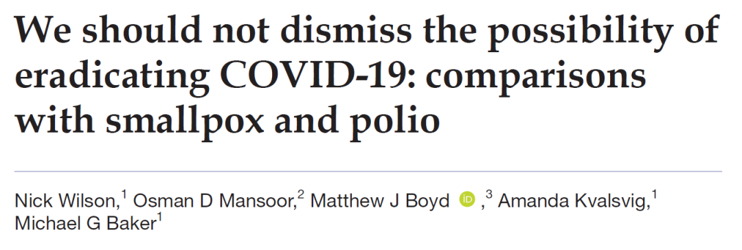 近日,BMJ Global Health 期刊发表了一篇题为:We should not dismiss the possibility of eradicating COVID-19: comparisons with smallpox and polio 的文章,从科学技术、社会政治和经济因素三个方面比较了新冠病毒、脊髓灰质炎病毒和天花病毒,认为在全球范围内根除新冠病毒是可行的,这种可能性低于根除天花病毒,但高于根除脊髓灰质炎病毒。