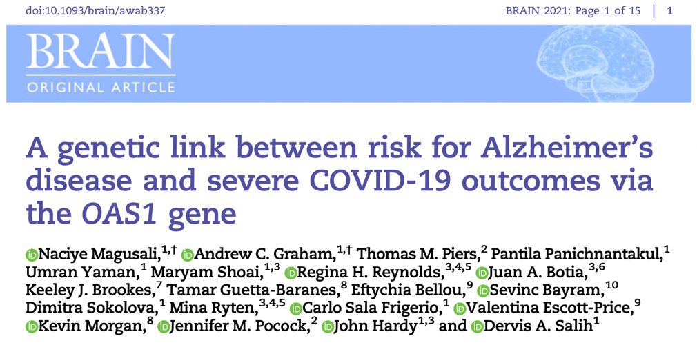2021年10月8日,伦敦大学学院的研究团队在 Brain 期刊上发表了题为:A genetic link between risk for Alzheimer's disease and severe COVID-19 outcomes via the OAS1 gene 的研究论文。