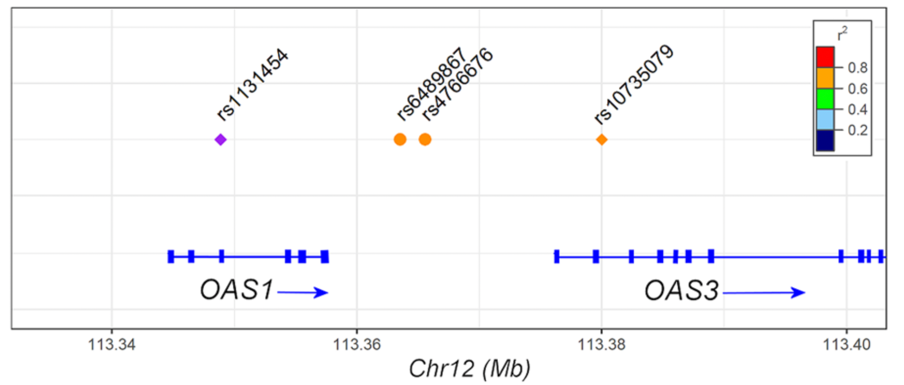 为了评估OAS1中阿尔兹海默症相关的遗传变异,他们在1313名散发性阿尔茨海默病患者和1234名对照个体中进行了SNP基因分型,发现OSA1的一种变异rs1131454与阿尔兹海默症存在显著关联。然后,他们在重症COVID-19患者中也发现了rs1131454和OSA1的另一种变异与COVID-19相关。这些变异都会使OAS1的活性减弱。这表明,与OAS1相关的单核苷酸多态性与阿尔兹海默症和重症COVID-19的风险相关。