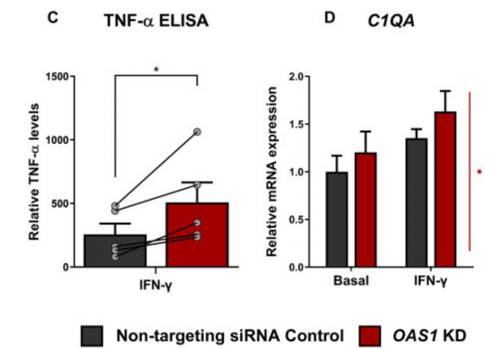 在经过处理以模拟COVID-19效应的免疫细胞中,研究团队发现OAS1控制着人体免疫细胞释放促炎蛋白的数量。他们发现,OAS1表达较弱的小胶质细胞对组织损伤的反应过度,引发了“细胞因子风暴”,这会导致身体攻击自身的自身免疫状态。