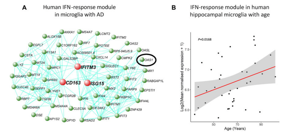 为了了解OAS1在小胶质细胞中的功能,研究团队利用WGCNA构建了一个包含Oas1a的小胶质细胞共表达转录组网络,含有Oas1a的模块包含许多干扰素反应基因和促炎细胞因子。他们观察到,Oas1a和干扰素反应模块在小胶质细胞中上调。与年轻小鼠的相比,Oas1a模块在老年小鼠中表达增加。与野生型小鼠相比,干扰素模块在阿尔兹海默症小鼠中表达增加。重要的是,在从患有阿尔兹海默症的人脑分离的小胶质细胞中也有类似的表达模式。同样地,在从重症COVID-19患者的肺泡提取的巨噬细胞也有类似的表达模式。这些发现表明与OAS1相关的基因网络随着年龄增长、淀粉样斑块和严重的COVID-19而上调。