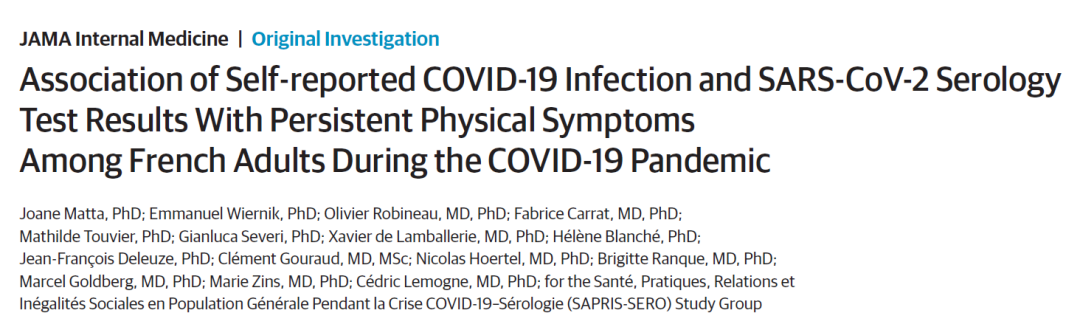 该论文题为:Association of Self-reported COVID-19 Infection and SARS-CoV-2 Serology Test Results With Persistent Physical Symptoms Among French Adults During the COVID-19 Pandemic.