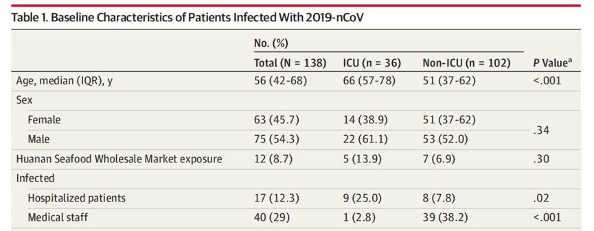 患者信息统计:在138名新型冠状病毒感染性肺炎(NCIP)住院患者中,平均年龄为56岁,其中75位患者为男性(54.3%)。存在医护人员(40[29%])和住院患者(17[12.3%])被感染的现象,因此推测2019-nCoV存在院内感染。