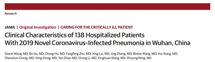 2月7日,国际四大医学期刊之一的 JAMA 杂志在线发表了一篇武汉市新型冠状病毒肺炎住院患者的临床特点分析的文章:Clinical Characteristics of 138 Hospitalized Patients With 2019 Novel Coronavirus–Infected Pneumonia in Wuhan, China,此项回顾性、单中心的病例调查研究由武汉大学中南医院完成。