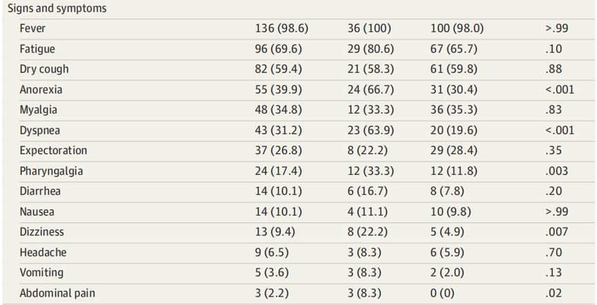 感染症状:常见症状包括发热(136[98.6%])、疲劳(96[69.6%])和干咳(82[59.4%])。97位患者(70.3%)血象中淋巴细胞数量减少,80位患者(58%)的凝血酶原时间延长和55位患者(39.9%)的乳酸脱氢酶升高。胸部CT扫描显示,所有患者肺部均有双侧斑片状阴影或毛玻璃样。