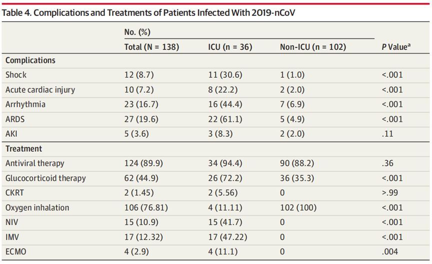 总而言之,此项研究通过统计分析武汉中南医院138例确诊为NCIP的住院患者的相关临床数据,总结了2019-nCoV的常见感染症状、药物治疗情况、患者病情进展以及治疗结果。