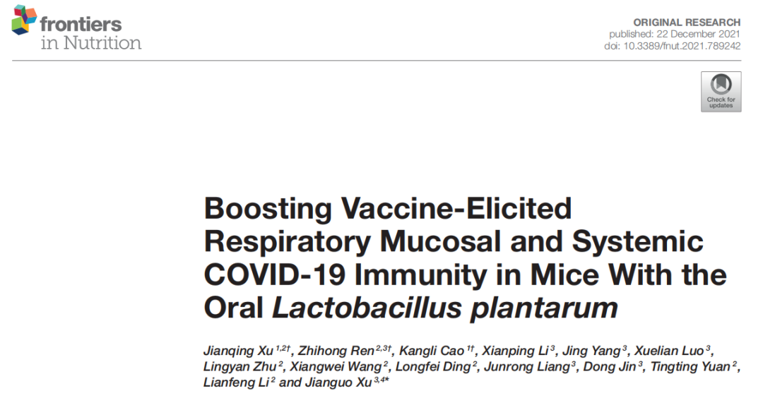 近日,中国疾病预防控制中心徐建国院士和复旦大学生物医学研究院徐建青教授团队开展合作研究,在 Frontiers in Nutrition 期刊在线发表题为:Boosting vaccine-elicitedrespiratory mucosal and systemic COVID-19 immunity in mice with the oral Lactobacillus plantarum 的研究论文。