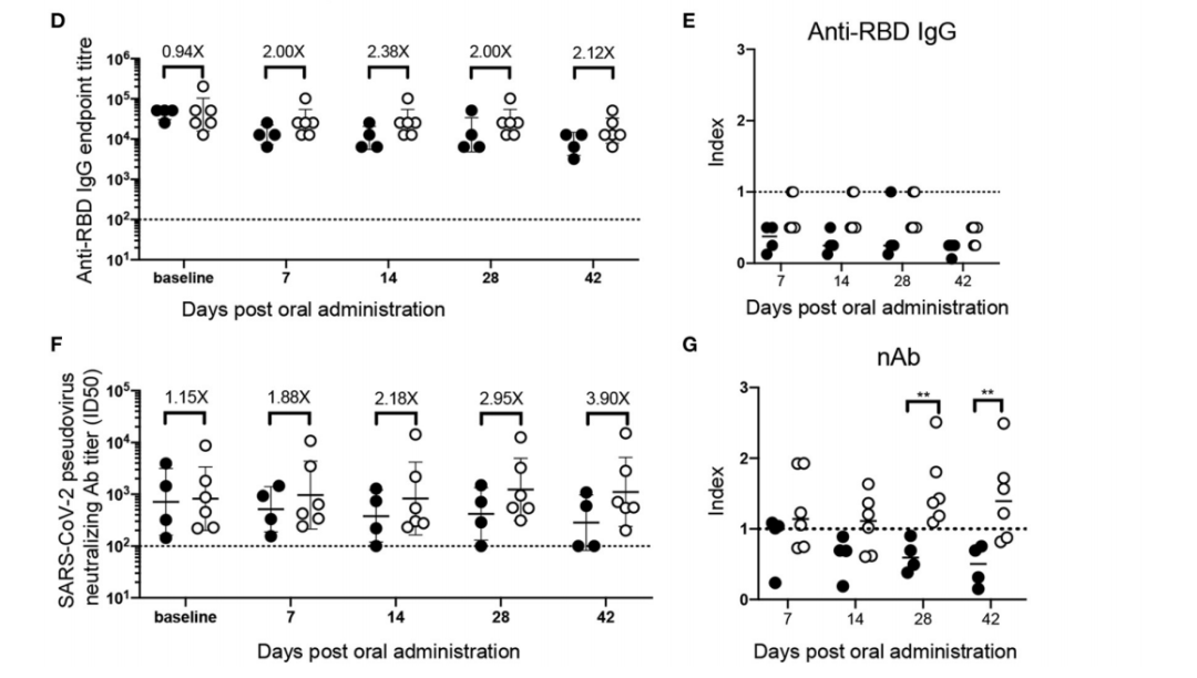 接种新冠疫苗六个月后,口服冠克菌株可改善小鼠的体液免疫反应