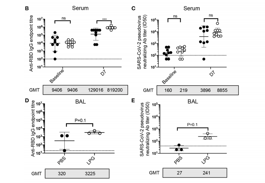 研究团队首先给小鼠接种了新冠疫苗,并立即给予口服植物乳杆菌冠克菌株(GUANKE),然后监测小鼠的抗体水平与T细胞应答。他们发现,与仅接种新冠疫苗的对照组小鼠相比,实验组小鼠血清中的中和抗体滴度升高2倍,支气管肺泡灌洗液(BAL)中的中和抗体滴度升高8倍。