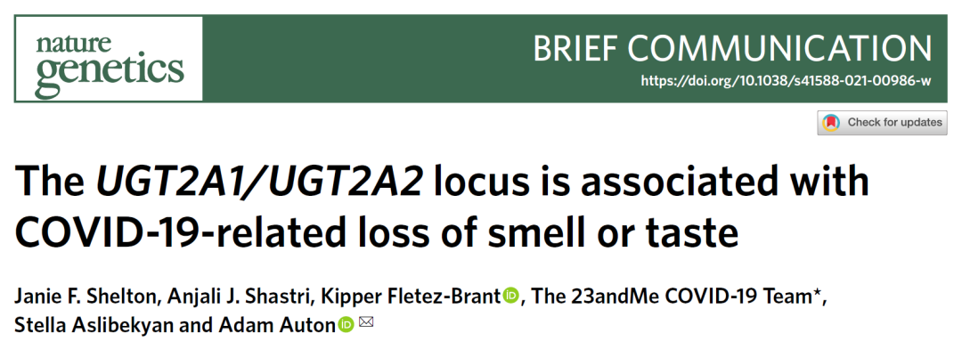 2022年1月17日,美国 23andMe 公司的研究团队在 Nature 子刊 Nature Genetics 上发表了题为:The UGT2A1/UGT2A2 locus is associated with COVID-19-related loss of smell or taste 的研究论文。