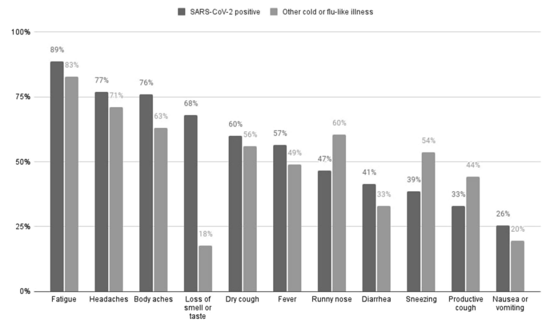 将感染新冠后出现的症状与感冒或流感样疾病的症状对比,嗅觉或味觉丧失是二者差别最明显的症状。