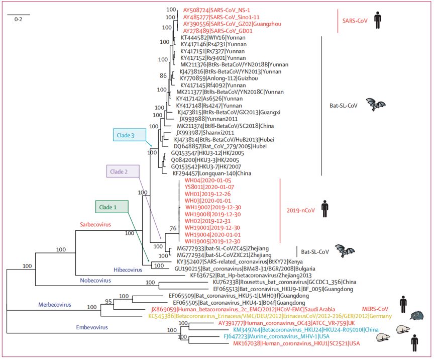 研究者对这些2019-nCoV基因组序列信息进行系统发育分析,从而确定2019-nCoV的种属分类地位,并推断其可能的起源。从9例确诊患者中获得的2019-nCoV基因组序列极为相似,表现出99.98%以上的序列一致性。值得注意的是,2019-nCoV与2018年在中国东部舟山采集到的两种类似于SARS的冠状病毒——bat-SL-CoVZC45和bat-SL-CoVZXC21密切相关(具有88%的一致性),但与SARS-CoV(约79%)和MERS-CoV(约50%)的亲缘关系较远。系统发育分析表明,2019-nCoV属于β冠状病毒属(Betacoronavirus)的Sarbecovirus亚属,具有相对较长的分支长度,与bat-SL-CoVZC45和bat-SL-CoVZXC21的亲缘关系最近,并在遗传上不同于SARS-CoV。