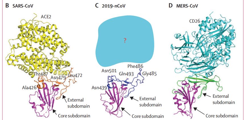 冠状病毒的S蛋白介导受体结合(S1区)和膜融合(S2区),对病毒感染宿主细胞起至关重要的作用。值得注意的是,2019-nCoV的S2结构域与bat-SL-CoVZC45、bat-SL-CoVZXC21的同源性约为93%——远高于S1结构域,而后者同源性仅为68%。更有趣的是,虽然2019-nCoV和SARS-CoV属于不同的支链,但两者在S1结构域中仍保留了约50个保守氨基酸。并且研究人员通过同源建模分析发现2019-nCoV受体结合结构域的外部子结构域与SARS-CoV十分相似,这表明2019-nCoV和SARS-CoV可能通过相同的受体入侵宿主细胞,即ACE2。